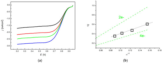 The electrocatalytic properties were examined with a rotating disc electrode (RDE) in 0.1 M KOH electrolyte. The polarization curves at different potentials and rotation rates (400–1225 rpm) are shown in Figure 11a. The Koutecky–Levich (KL) equation was used to describe the correlation between the current densities and rotation rate