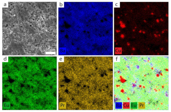 Energy-dispersive X-ray spectroscopy was also employed to evaluate the contribution of individual elements (EDS mapping) in the (Eu,Pr)BCO system (Figure 2).