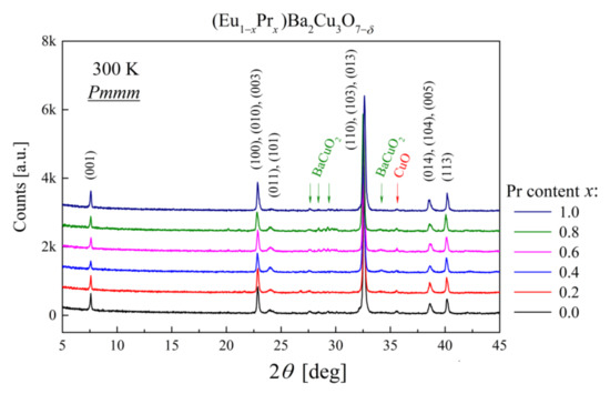 Eu2O3, Pr2O3 (Sigma-Aldrich, St. Louis, MO, USA, 99.99% purity), CuO (Alfa-Aesar, Haverhill, MA, USA, 99.999% purity), and BaCO3 (POCH, Gliwice, Poland, 99.6% purity) were used to prepare the Eu1−xPrxBCO samples. First, the materials were synthesized by a conventional solid-state reaction method by calcining the stoichiometric weighed substrates at 950 °C for 24 h. Then, the sinters were crushed, ground, and calcination was repeated. Next, sintered materials were ground again and pelletized under a uniaxial pressure of 800 MPa. Finally, the pellets were annealed in an oxygen flow of 20 L/h at 920 °C. After 33 h, the temperature was lowered to 400 °C and held for the next 33 h, as described [8,9,30].