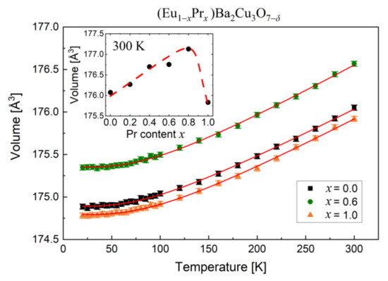 Thus, detailed structural considerations confirm the BaCuO2 and CuO inclusions, while the question of accurately estimating the oxygen in the samples remains. Low-temperature measurements were also carried out to investigate the lattice parameters under and above the superconductivity transition (Figure 7). The results for three selected samples x = 0.0, 0.6, and 1.0 reveal significant differences in the volume of unit cells depending on the Pr concentration. These relationships can be approximated by the Debye temperature formula [37]: