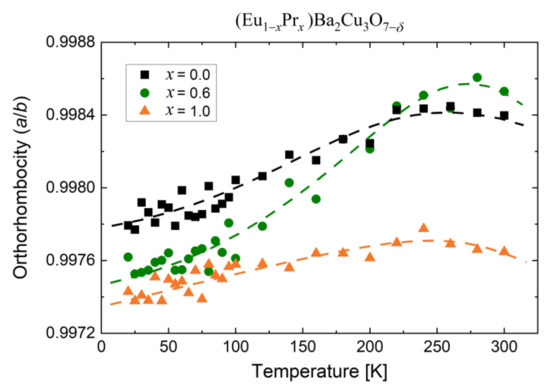 There is a clear tendency for the a/b ratio o increase with temperature; however, the magnitude of these changes is different. The rate of orthorhombicity change for PrBCO is slowest with temperature, while the a/b rate is slightly higher for EuBCO. The found difference indicates the high rigidity of the crystallographic structures for parent compounds. Nevertheless, the most interesting behavior is observed for Eu0.4Pr0.6BCO, consisting of significant growth in the a/b ratio. At low temperature, the orthorhombicity is closer to PrBCO, while above 200 K, the a/b ratio is even higher than for EuBCO. It suggests a relatively large susceptibility of the lattice constant (a) to temperature changes, in contrast to the lattice parameter (b).