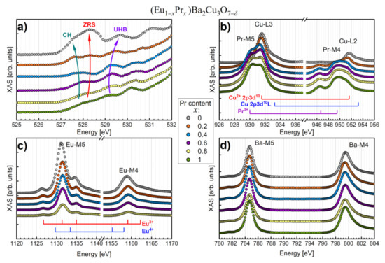 On the other hand, the Ba M4,5-edges do not show any disturbances as a function of Pr content (Figure 10d), which means no significant changes occur in the Ba sublattice. Furthermore, only a tiny pre-peak at 781.4 eV, which corresponds to the forbidden 3P1 transition, indicates a small hybridization of the Ba 6s6p states with Cu 3d electrons.