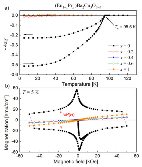The magnetic susceptibility curves of (Eu,Pr)BCO are shown in Figure 11a, and the hysteresis loops recorded at 5 K are presented in Figure 11b.