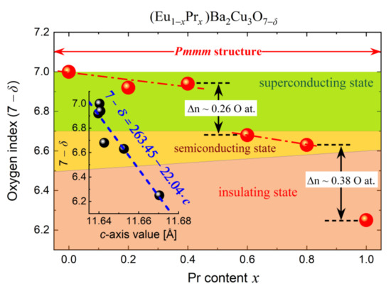 As shown in Figure 5, the PrBCO diffraction pattern exhibits some shifts of the Bragg reflections toward the lower 2θ angles compared to other samples. Indeed, analysis of the lattice parameters a and b suggests that PrBCO is the most oxygen-deficient material due to a significantly reduced unit cell volume. As other (Eu,Pr)BCO materials reveal a regular rise in lattice parameters (Figure 6) due to the lanthanide contraction principle [34,35], it would be expected that substituting Pr for Eu should increase the Pmmm unit cell volume. This effect is directly observed, although only up to x ≤ 0.8.