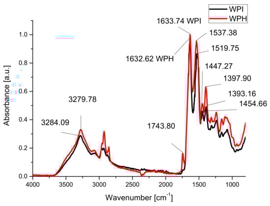 Amide I absorption band shifts to smaller wavenumbers, 1632.62 cm−1 compared to 1633.74 cm−1 for sample WPH due to the disruption of C=O· · ·H–N hydrogen bonds in whey following hydrolysis, and can be associated with the decreasing of the α helix structures in the proteins [77,78].