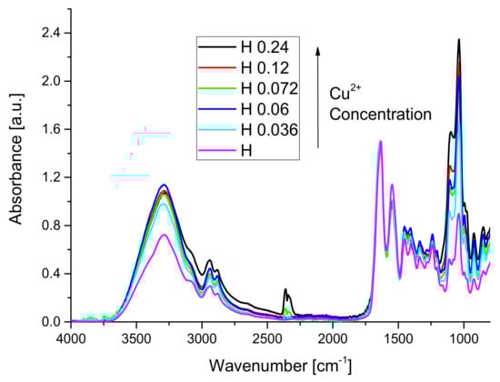 The influence of copper concentration of the FT-IR spectra of hydrogels is presented in Figure 2.