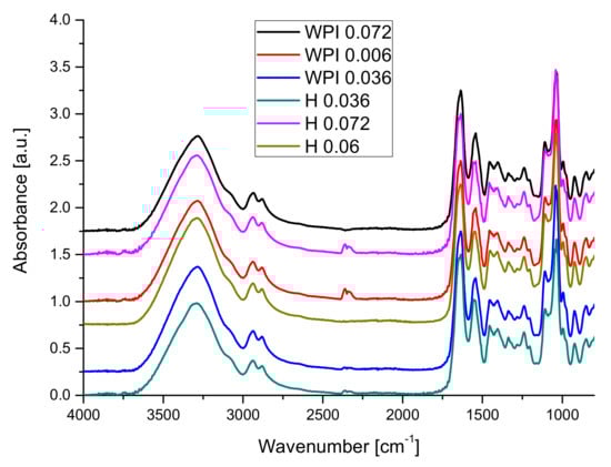 The influence of using hydrolyzed whey protein on FT-IR spectra is presented in Figure 3.