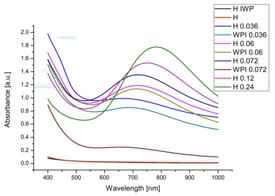 Proteins from gelatin and whey and their hydrogels absorb small wavelengths in the UV region of the spectrum, presenting an absorption peak at 280 nm [81] and low absorption in visible and near infrared. Globular proteins from whey and gelatin absorb wavelengths from UV region of the spectrum in the range 190–220 nm due to peptide bonds and amino-acids and around 280 nm due to absorption of tyrosine and tryptophan [81].