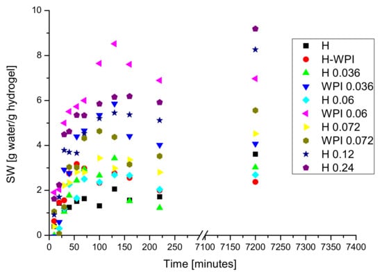 Similar behavior has been reported for hydrogels based on whey protein concentrates loaded with caffeine [82]. They concluded that swelling curves deviate from the classical Fickian model because the swelling process is not a passive diffusion involving the penetration of solvent into the pores of the hydrogels network, but includes a simultaneous relaxation of the protein’s chains conducting to a significant increase in volume.
