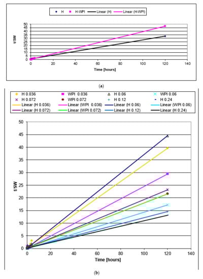 The plot of against t for samples H and WPI are presented in Figure 6a, while for samples containing copper in Figure 6b. In all cases, a straight line was obtained with high values for correlation coefficients.