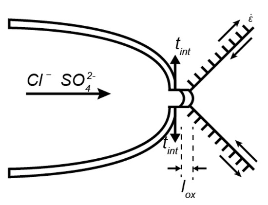 The electrochemical model at the crack tip was set up with the slip-oxidation model by Ford [4,30]. The transport of species to the crack tip was based on the diffusion model with the assumption of a preexisting long crack, compared to relevant sizes in the crack tip area such as oxide thickness and plastic zone. The slip-oxidation model is based on Faraday’s relationship between metal transformation (M+) to oxide and the oxide charge density. The slip-oxidation model is described as