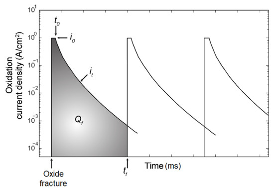 where is the initial current density, is the time for repassivation activation, and m is the decay slope, and the time between ruptures of the oxide film, or fracture time, is denoted as . The cyclic behavior of the current density i is shown in Figure 2, as the film ruptures the dissolution is at its highest value, but within milliseconds repassivation begins and the current density decreases. The next peak is due to film rupture and exposing new virgin material.