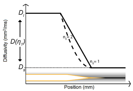 Diffusivity according to Equation (7) as a function of crack position. The solid line, gives a linear function while , the dotted line, gives a quadratic shape.