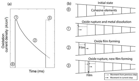 In Figure 5 the adaptive growth is shown in four steps. In the first initial step (0) in Figure 5a, no current density is present, and in Figure 5b the cohesive elements are in their initial arrangement. In step (1) the maximum current density is present, but the film has not started to grow. The movement is for the boundary cohesive elements, representing only dissolution. In step (2) the film starts to grow, therefore the boundary element nodes are locked and the elements start to grow. The thickness of the element was controlled by Equation (8), which gave the horizontal position of the moving nodes. In the next step (3), the cohesive element containing the oxide film became fully damaged due to the applied loads and its decreasing fracture energy which would correspond to a ruptured oxide film. At this instant, the ruptured oxide film element changed into liquid diffusivity element , making the concentration move forward to interact with the next element. The process repeats itself but with the next element, creating crack advancement.