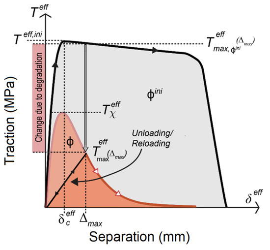 The degradation was controlled by reducing the fracture energy, which could be done in two ways, by changing the maximum cohesive strength Teff or by changing the softening shape through the parameter α in the TSL [14]. For a given energy reduction, degradation could favor a fast change to a brittle material by keeping a high maximum cohesive strength, see the dashed concave TSL line in Figure A4, or remaining ductile, see the lower convex solid TSL in Figure A4. The degradation process was introduced in two numerical steps. The fracture energy Φini was first reduced from the initial TSL, the top solid curve in Figure A4 to the lower solid curve with fracture energy Φ and strength in the figure. Then the TSL softening parameter α was adjusted for the degraded maximum cohesive strength Tχ. The control parameter χ was defined as