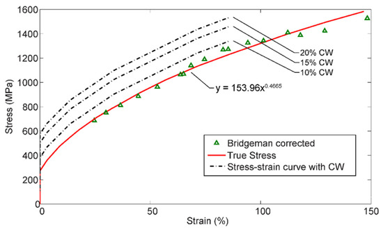 The model was set up using the subroutines in Abaqus and standalone Fortran 90 codes. All results were derived for the same material, austenitic stainless steel 316L, and compact tension (CT) geometry with the geometrical properties: initial crack length mm, thickness mm, half-height mm, and length mm, see Figure 7. The mesh was refined in three steps with the finest along the crack path. The model contained 36,176 plane strain elements for the bulk material. The side of smallest bulk elements, which was along the crack path, was 1 μm. Ninety-four cohesive elements were then placed at the interface between each bulk element along the crack path, see Figure 5. The cohesive element was then constrained with the Abaqus TIE subroutine to follow the bulk element along the crack path, but with the freedom to be manipulated by the adaptive oxide framework. The bulk material was formulated as elastic-plastic material with piecewise linear isotropic hardening, following the curve in Figure 8. The bulk material data was obtained from the experiments by van Eeten and Nilsson [36]. The figure includes the cold work (CW) at 10, 15, and 20% [37], which corresponds to the dotted lines in the stress-strain figure. The Young’s modulus was set to GPa, Poisson’s ratio was , and the undeformed yield stress was MPa. The CT specimen was loaded to , which corresponded to , 9, or 12.4 kN. The concentration at the boundary was set to c = 10–90 ppb, which is typical for NWC [14].