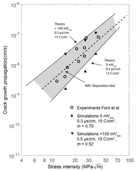 The crack growth rate due to some stress intensity factor values was studied in different environments. The crack tip was exposed to = 15, 27, or . The stress intensity factor KI was calculated at the initial crack length , giving the force P acting on the force BC. The force and the environmental parameter m were kept constant throughout each simulation. The results were compared to the results by Ford et al. [4]. The conditions in the experiment were sensitized 304 stainless steel in LWR environment. For the simulations, the mechanical material data from 316L was used since the mechanical data for 304 and 316L are similar, and the IGSCC results by Andresen [40] shows equal behavior with respect to . Two environments were studied. In the first environment, the conductivity was 0.5 µs/cm and the corrosion potential was +100 mVshe and for the second environment, the conductivity was 0.3 µs/cm and the corrosion potential was 0 mVshe, which gave the environmental parameter m = 0.52 and 0.70 respectively from experiments by Ford et al. [4], se Appendix A. The results from the simulation are shown as triangles in Figure 11. The upward pointing triangles shows the results for the crack growth rate in the environment corresponding to m = 0.52 and the downward facing triangles in the less corrosive environment with m = 0.70. The experimental data, shown as circles, are from Ford et al. [4], the dotted line and the semi-dotted lines are two theoretical curves are also by Ford et al. [4] from the slip-oxidation model [4,42]. The two theoretical curves are computed for the conductivity 0.5 and 0.3 µs/cm and the corrosion potential +100 and 0 mVshe, which are the same environments that were simulated. The full line is the NRC regulatory relationship used for structural integrity evaluations [43]. The simulation with m = 0.70 which corresponded to the lower bound theory fitted well and the simulation with m = 0.52 which corresponded with the upper bound also fitted well.
