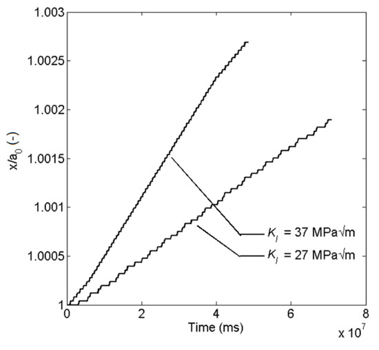 The crack growth in Figure 12 is for = 27 and with the environmental parameter m = 0.52. The step like curves are the result from the cyclic film rupture process.