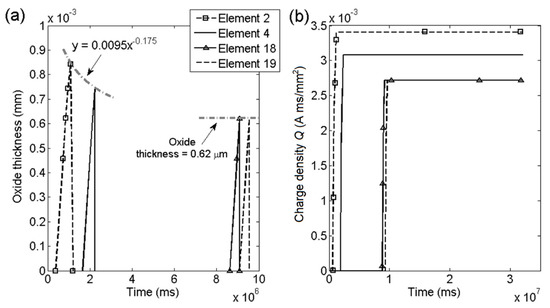 Figure 13 shows the oxide thickness and oxide density for four cohesive elements at = 27 and Figure 14 shows the same response for the same elements at = 37 . The change in stress intensity factor was obtained by changing the force boundary condition. The first two element chosen were affected by the initial plastic zone and therefore shows a higher result, the two subsequent elements 18,19 showed stable result for both applied boundary conditions. At elements 18,19 for both stress intensities the oxide thickness converged into similar results over time. The lower stress intensity factor = 27 exhibited thicker oxide than for the higher stress intensity factor. The results show that higher crack growth rates are obtained by thinner oxides and more frequent oxide ruptures, which was expected based on Equation (5). In Figure 13b and Figure 14b the charge density was shown for the same elements, showing fast growth during oxide growth and no increase after oxide rupture. The charge density shows similar value for elements 18, 19 for both stress intensity cases. The animations of the contour plots of the FE simulations are available in Sedlak [33]. The animations show the two simulations illustrated in Figure 11 and Figure 12 with = 27 and 37 . The contour plots were evaluated in, concentration, stresses in y-direction and displacement.