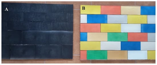 The first test demonstrator for the construction sector was designed as a cladding panel for outdoor applications made from recycled rPP/NP composite panels. Figure 2 presents a cladding panel used for further research (A) and a panel coated with a decorative (B). In order to evaluate the environmental impact of the rPP/NP, ion and heavy metal release, tests were performed. The tests were based on the methods described in CEN/TS 16637-2:2014 [28] and focused on the release of hazardous substances from construction products into surface water, groundwater and soil. The purpose of the tests was to determine the characteristics of the leaching process and to evaluate the release of environmentally harmful substances.