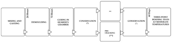 One day after their production, the specimens were demolded and stored for three days in a humidity chamber at 20 °C and 95% relative humidity. They were then moved to their respective conservation condition until testing at 60 days. At 28 days of conservation, some of the specimens were pre-cracked (maintaining the target temperature during the test) and stored again in their respective environment. The procedure is represented in Figure 3.