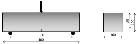 Given that there is no standard protocol for studying the influence of moderate temperatures on FRCs, mechanical behavior was evaluated by means of a three-point bending test on notched beams. These tests were performed in an INSTRON 3382 machine, following a methodology based on UNE-EN 14651:2007+A1:2008 [30] with some modifications. The set-up configuration was scaled down to 2/3 of the standard test. Thus, parameters such as the distance between the support (330 mm), the specimens’ dimensions (100 × 100 × 400 mm³) and the depth of the notch (15 mm) were obtained considering this factor. The scheme of the adapted protocol is represented in Figure 4.