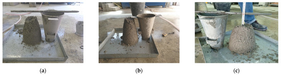 Examples of the visual aspect of the concrete mixes: (a) Batch 3, P1 MSFRC; (b) Batch 6, MSFRC; and (c) Batch 7, SFRC.