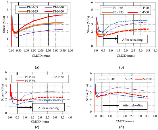 The mean stress-CMOD curves for each group are displayed in Figure 7a–d according to fiber type, temperature and pre-cracked/uncracked condition. Note that each curve is the average of the 4 tested specimens. A representative color was defined for each temperature: blue represents 5; purple, 20; orange, 35; and red, 50 °C. The dashed line represents the data obtained after reloading. The results showed that the selected synthetic- and steel-fiber dosages had comparable residual strength.