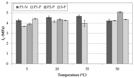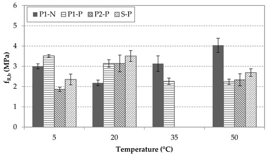Figure 10 shows the temperature effect on the residual flexural strength at CMODb for all groups. This parameter is the one that suffered the highest variation levels in trends and CV (%). The S and P2 specimens exhibited similar behavior for between 5 and 50 °C. For the specimens reinforced with the macrosynthetic fiber P1, temperature influenced and additional differences were detected between pre-cracked and uncracked specimens. The residual flexural strengths of the P1-N specimens increased when the temperature rose, but the contrary effect was observed for P1-P specimens. This difference could be explained by the fibers’ being embedded within the uncracked matrix, which could have provided a protective cover that helped minimize susceptibility to environmental effects. Another explanation may be that hydration improved the fiber-matrix bond.