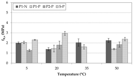 Figure 8, Figure 9 and Figure 10 display the values of and (j = a, b) for each type of fiber, each condition of pre-cracking and each temperature, regardless the age of testing. Figure 8 shows similar results for residual peak-load flexural strengths for S-P and P1-N fibers at temperatures that had no significant effect on the . In contrast, the P2-P and P1-P specimens displayed a slight rising trend with increasing temperature, which may have been related to an increase in the matrix strength since the parameter was heavily related to the matrix’s mechanical properties, mainly compression strength [8]. It may be concluded that the interaction between the pre-cracked condition and temperature may be significant in this case and be worth an in-depth study.