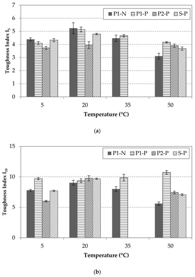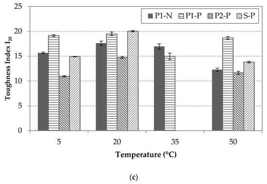 For the toughness results, Figure 11 compares the different indices at different temperatures for each condition and fiber type. As it can be seen for I5 in Figure 11a, the temperature influence was not significant, but a slight change could be detected for S-P and P1-N at 50 °C. For I10 and I20, the toughness trends were similar (Figure 11b,c), reaching their maximum at 20 °C in all the groups, except for P1-P.