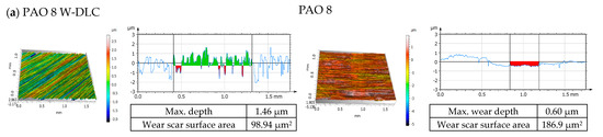 - Wear scar size: The addition of ZDDP to PAO was responsible for a considerable decrease in the wear scar area and the wear depth on the disc. The values obtained for PAO + graphene were higher than those reported for PAO. Adding both ZDDP and graphene caused a significant decrease in the wear scar size; it was much smaller than that measured when PAO with no additives was used.