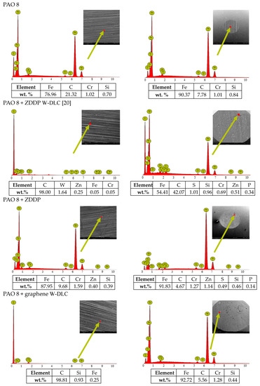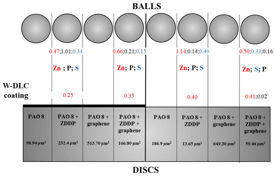 - Graphene added to the lubricant causes more intensive transport of energy from the solid to the system. This could be the reason why for PAO + graphene the wear was very high. In the presence of both additives, part of this energy reaches ZDDP molecules, which undergo triboreactions faster than when ZDDP is the only additive (higher concentrations of Zn, P and S). The tribological phenomena are greatly dependent on the surface properties of the solid elements in contact. The results obtained for W-DLC-coated steel discs differed from those reported for uncoated discs. It is thus evident that graphene and ZDDP interact, and the mechanism of this interaction is likely to be as follows. Graphene increases the transfer of energy from the solid surface to the molecules inside the lubricating film. Part of this energy is supplied to ZDDP molecules, initiating reactions leading to their decomposition. The rate of triboreactions involving ZDDP decreases, and so does the friction and wear of the contact surfaces (ball and disc).