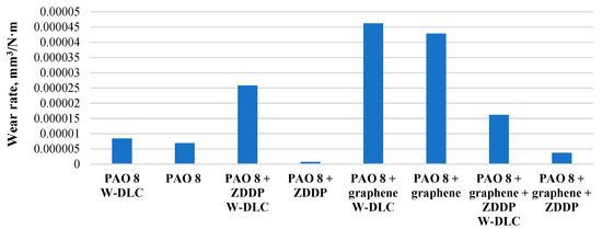 - Linear wear: The addition of ZDDP to PAO resulted in lower values of linear wear. For PAO + graphene, they were even lower. The wear measured for PAO + ZDDP + graphene was similar to that obtained for PAO + ZDDP.