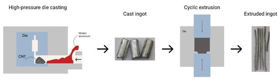A combined two-staged method was developed to overcome these issues [14]. The authors developed a method of fabrication of metal matrix composites in which multiwall carbon nanotubes (MWCNTs) were inline dispersed in the Al matrix [14]. Figure 1 shows the method, which includes two main steps. The first step is high-pressure die casting (HPDC) of aluminium, where the MWCNTs are added to the short sleeve of the HPDC furnace prior to aluminium incorporation. In the second step, the obtained cast ingot passes ten cycles of extrusion (CE) to break up agglomerated MWCNTs clusters and to align them in the direction of extrusion.