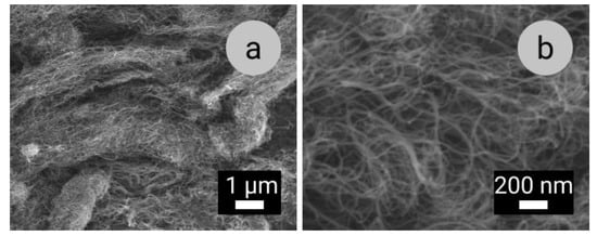 Scanning electron microscopy images of as-received MWCNTs at: (a) lower (10.00 K) and (b) higher (50.00 K) magnifications.