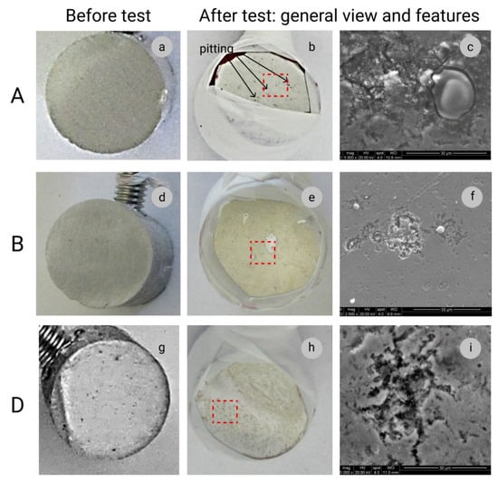 Sample A—pure aluminium 1070 produced by die casting and direct extrusion: (a)—the test surface before the test; (b)—image of the sample’s surface after the test; (c)—SEM image of specific features on the sample’s surface because of corrosion. Sample B—Al-based composite sample with 0.25 wt.% of MWCNTs: (d)—the test surface before the test; (e)—image of the sample’s surface after the test; (f)—SEM image of specific features on the sample’s surface because of corrosion. Sample D—Al-based composite sample with 0.5 wt.% of MWCNTs: (g)—the test surface before the test; (h)—image of the sample’s surface after the test; (i)—SEM image of specific features on the sample’s surface because of corrosion.
