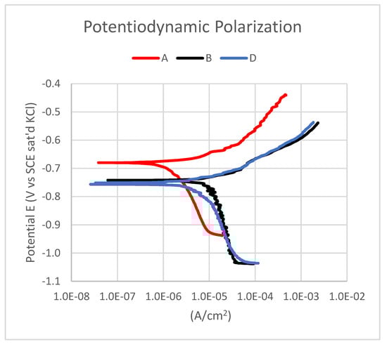 Potentiodynamic electrochemical measurement of sample A—pure aluminium 1070; sample B—Al 1070 + 0.25 wt.% MWCNTs; and sample D—Al 1070 + 0.5 wt.% MWCNTs.