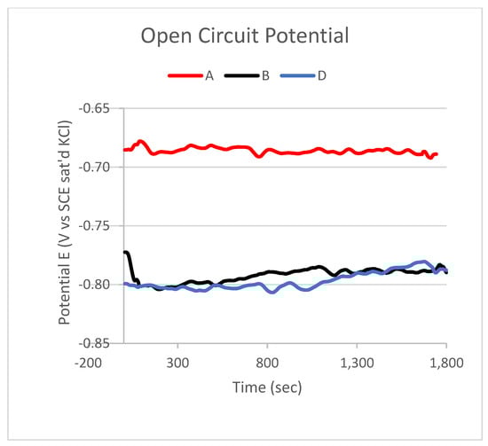 Open circuit potential measurement of sample A—pure aluminium 1070; sample B—Al 1070 + 0.25 wt.% MWCNTs; and sample D—Al 1070 + 0.5 wt.% MWCNTs.
