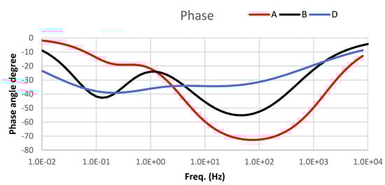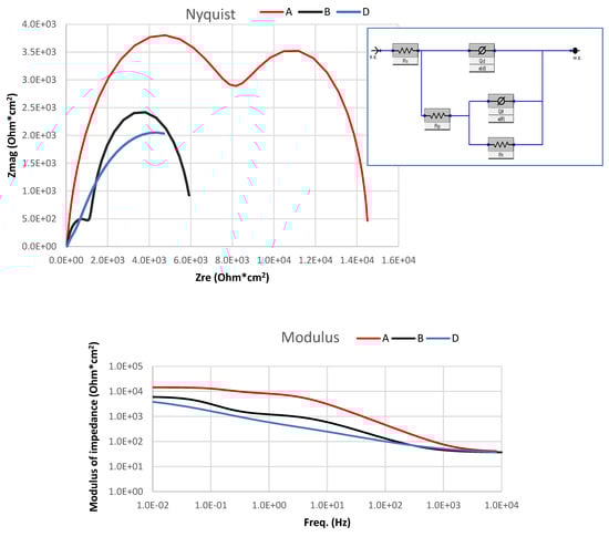 Electrochemical impedance spectra of sample A—pure aluminium 1070; sample B—Al 1070 +0.25w.% MWCNTs; and sample D—Al 1070+0. 5w.% MWCNTs.