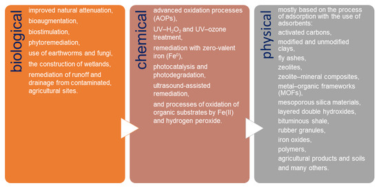 Currently, the removal of pesticides and their derivatives from the environment is one of the worldwide environmental alarms. Due to the wide use of different types of pesticides, it is extremely difficult to develop a single universal method for their removal. Basically, three groups of methods are used for pesticide remediation: biological, chemical, and physical (Figure 1). Biological remediation results in the transformation of organic compounds into harmless products such as CO2 and H2O [26,27,28,29,30,31,32]. These methods are of low cost and believed to be more environmental-friendly compared to the physical and chemical remediation methods. In chemical remediation, pesticides are converted into harmless compounds through certain agents by the way of chemical reactions [33,34,35,36,37,38,39,40,41]. Chemical treatment is usually combined with physical remediation processes; however, the costs of these combined treatments are very high and vary depending on the matrix [42]. Physical remediation is based mostly on the process of adsorption, which is one of the most commonly used methods for water purification because of its capacity, efficiency, and applicability on a large scale [3,22,43,44,45,46,47,48,49].