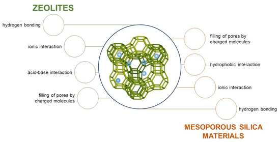 Similar to the modification of zeolites with inorganic ions, the incorporation of organic substances also significantly increases their adsorption capacity, as confirmed in the work of Ortiz Otalvaro and coworkers [105], who examined the influence of the addition of 3-aminopropyltriethoxysilane on the adsorption of MCM-41 toward pesticide 2,4-D. The modified MCM-41 (APTES-MCM-41) showed enhanced adsorption capacity for anions and reversed charge development, although no meaningful changes were exhibited in both the external texture and the mesoporosity. The adsorption of 2,4-D on the modified solid was much higher than on pure MCM-41. The results also indicated that the adsorption of 2,4-D strongly depends on the pH—low pH values were much more favorable. Expectedly, the immobilization of adsorbate was quick at the initial state (up to 5 min), which may be connected to the direct binding between the adsorbate and aminopropyl surface groups of adsorbent; however, further adsorption was much slower (above 5 min). This can be due to the fact that 2,4-D requires a more time to occupy all the binding sites due to the narrow pores. The authors indicate that the main factors responsible for the adsorption reactions were electrostatic attractions combined with hydrogen bonds between the pesticide’s functional groups and the silica’s amino groups [105].