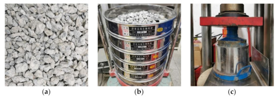 The recycled aggregate was obtained from waste concrete members after crushing and screening processes, the processed recycled aggregate is shown in Figure 1a. The basic mechanical properties of recycled aggregate should be in accord with the Chinese Standard (GB/T 25177) [33]. The particle size distribution, crushing index, and apparent density were tested by the method in the Chinese Standard (GB/T 14685) [34]. In addition, the water absorbed rate was tested by the method in the Chinese Standard (GB/T 17431.2) [35]. The test processes are shown in Figure 1b,c.