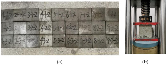 Nine concrete cube specimens (150 mm × 150 mm × 150 mm) of each mix proportion were poured, removed 24 h later and watered for curing at ambient temperature (Figure 2a). It should be noted that three of the specimens were tested after 7-days of curing and six were tested after 28-days of curing. The test was carried on the TYA-2000 electro-hydraulic pressure testing machine, as shown in Figure 2b.
