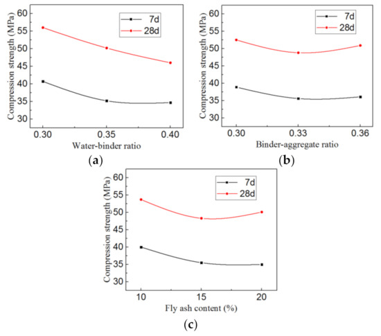 In Figure 3, the following conclusions can be summarized: (a) The compressive strength decreases with the increase in the water-binder ratio, the relationship of 28-day compressive strength shows a line trend; (b) the compressive strength has an unclear change with various binder-aggregate ratios, which means that the binder-aggregate ratio has a slight effect; (c) the 7-day compressive strength decreases with the increase in the fly ash content, while the 28-day compressive strength with the fly ash (20%) has rallied slightly, probably due to the fact that the pozzolanic effect and micro aggregate effect of fly ash have not been fully stimulated at the early curing stage.