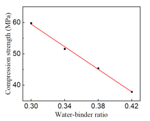 The relationship between the 28-day compressive strength and water-binder ratio is summarized in Figure 4. It is easily found that the compressive strength decreases linearly with the increase in the water-binder ratio.