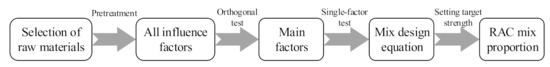 In summary, the simple mix design method of RAC can be illustrated in a flow chart (see Figure 5). Furthermore, the flow chart consists of the following steps: (1) Based on the practical engineering, the raw materials are selected, including different recycled aggregates, cement type, binding material type, coarse aggregate type, grading of aggregate, fine to coarse aggregate ratio, concrete admixture, etc.; (2) all influence factors for strength are listed in the study; (3) based on the orthogonal test, the main factors are determined as variable, and secondary factors are set as fixed values; (4) based on the single-factor test, the mix design equation is established; (5) according to the target strength, the RAC mix proportion is computed by the mix design equation.