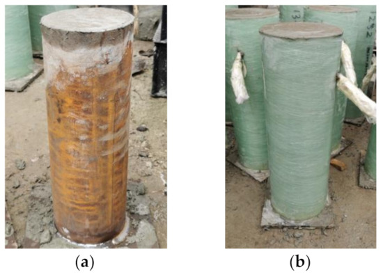 Based on the existing researches [37,38], the mechanical properties of RAC are affected by the recycled aggregate, due to the weakened properties of recycled aggregate and interface layer between the cement paste and aggregate. It is generally believed that the lateral confining effect is provided by the high property material jacket, including steel tube and FRP [28,29,39]. According to the different confining mechanisms, three kinds of specimens would be studied in the following section: The unconfined RAC columns (RCC), RAC filled in steel tube (RCFST), and RAC filled in glass-FRP tube (RCFGT).