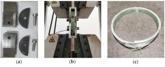 For RCFGT3 and RCFGT4 specimens, the GFRP tubes were prefabricated in a factory, the winding angle of GFRP tubes was 80°, and the thicknesses were 5 and 8 mm. According to Reference [40], the tensile test of the GFRP tubes were conducted using the separation plate (Figure 7a). The test process was conducted in the following steps: (1) The GFRP tube was cut into a 30 mm-wide ring; (2) the ring was installed on the outer edge of the separation plate; (3) two circumferential strain gauges were pasted on both sides of the GFRP ring surface close to the separation plate gap; (4) the assembled coupons were tested using the WAW-1000 microcomputer controlled electro-hydraulic servo universal testing machine (Figure 7b), while the GFRP coupon after the test was shown in Figure 7c. The coupon test results are listed in Table 9.