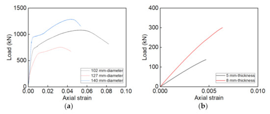 To reflect the axial compressive behavior of confining material, the load-axial strain curves of steel tubes and GFRP tubes are shown in Figure 8. The axial strain of these curves is the ratio of displacement measured by two LVDTs to the column height. It is apparent in Figure 8 that the curves of steel tubes include the elastic stage, harden stage, and soften stage, which correspond to the elastic state, yield state, and local buckling state of steel tubes. The curves of GFRP tubes show linear trends. These observations are important for the experimental analysis of the stress-strain curve of core RAC in the steel tube or GFRP tube.